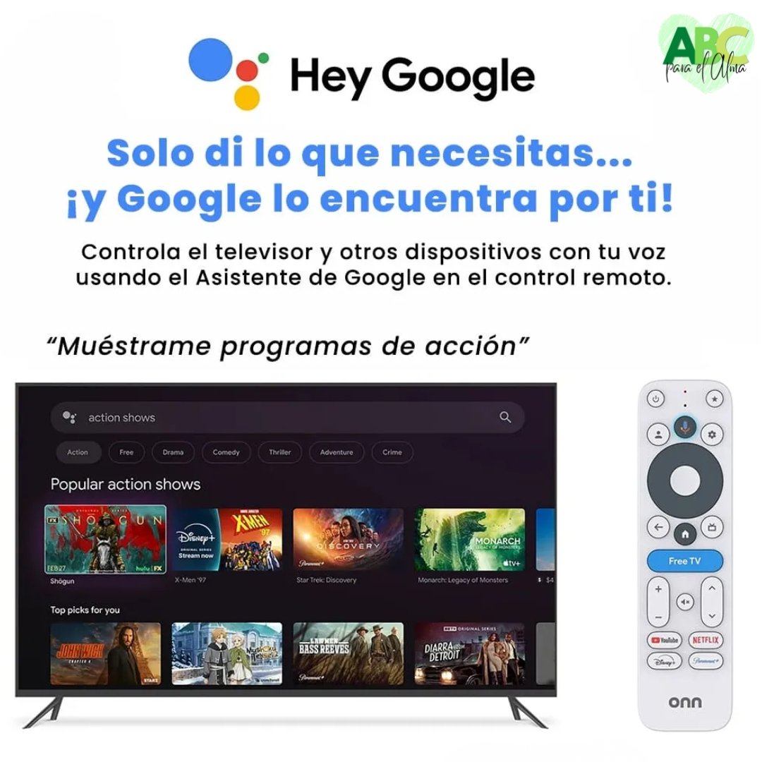 Incluye control remoto por voz, permitiendo navegar y buscar contenido fácilmente usando Google Assistant. Solo di “Hey Google” y encuentra películas, abre apps o controla dispositivos inteligentes del hogar.