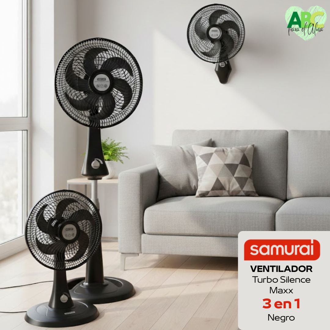 El Ventilador Samurai Turbo Silence Maxx 3 en 1 fue diseñado para quienes quieren potencia real sin ruido molesto y con la libertad de usarlo en tres presentaciones: